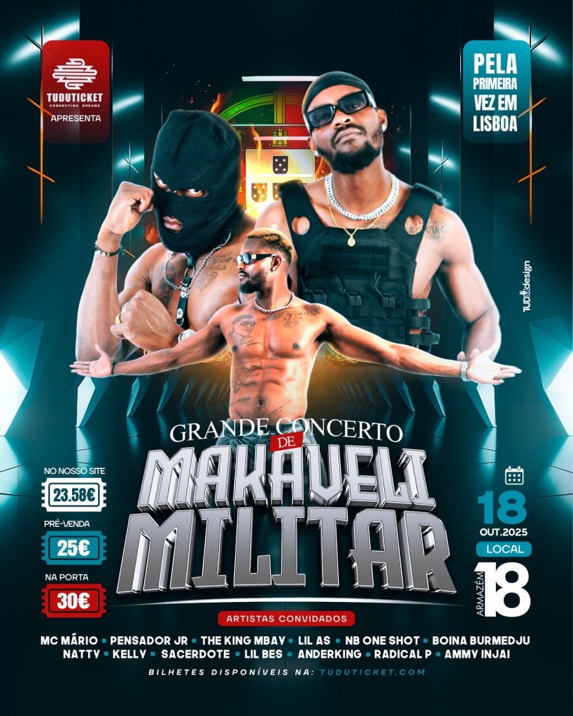 No dia 18 de outubro, o armazém 18 será palco do concerto de Makaveli, o autor do mega hit “Vida i di Bo” prepara uma noite inesquecível, marcada por energia,… Leia mais: Tudu Ticket apresenta, pela primeira vez em Lisboa, o grande concerto de Makaveli Militar - Mitchy Baby e J Money lançam “Kin Ki Dê”